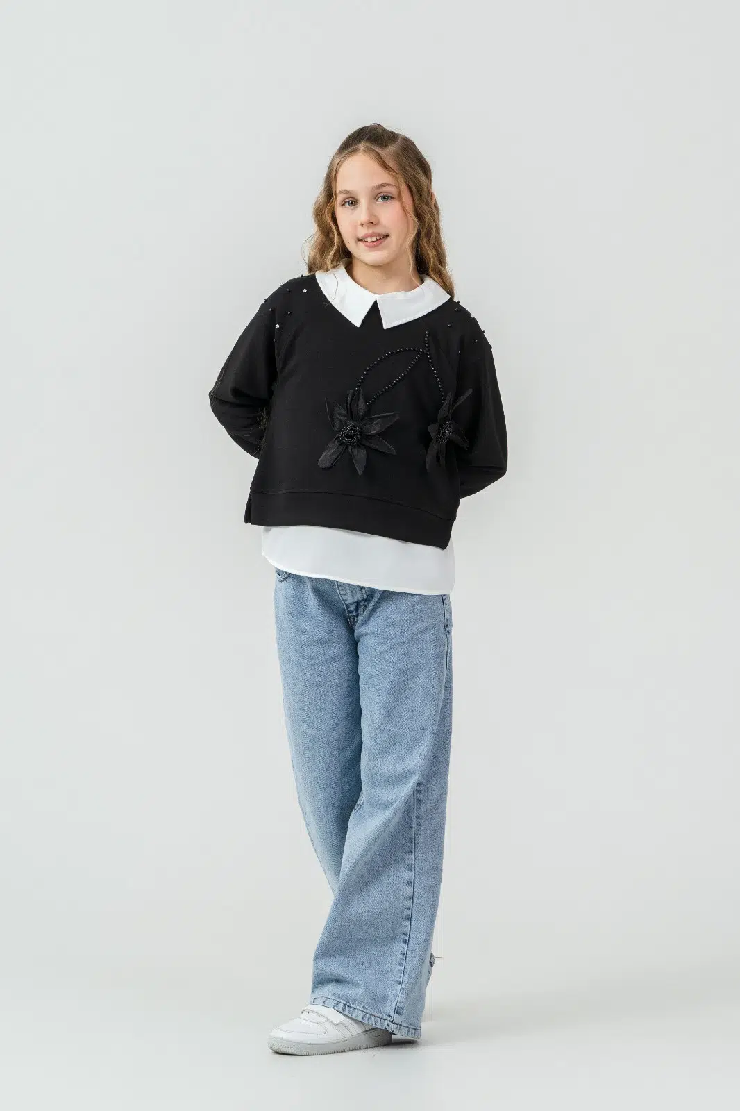 KIZ ÇOCUK BAYRAMLIK ÇİÇEKLİ TAŞLI KOT PANTOLONLU 2Lİ TAKIM