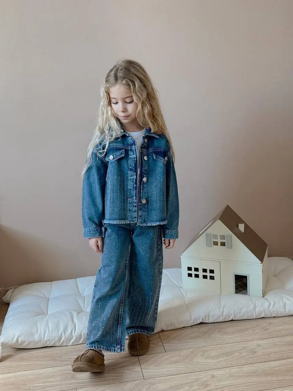 EtiketlerKIZ ÇOCUK KOT CEKETLİ KOT PANTOLONLU TAŞLI TAKIM